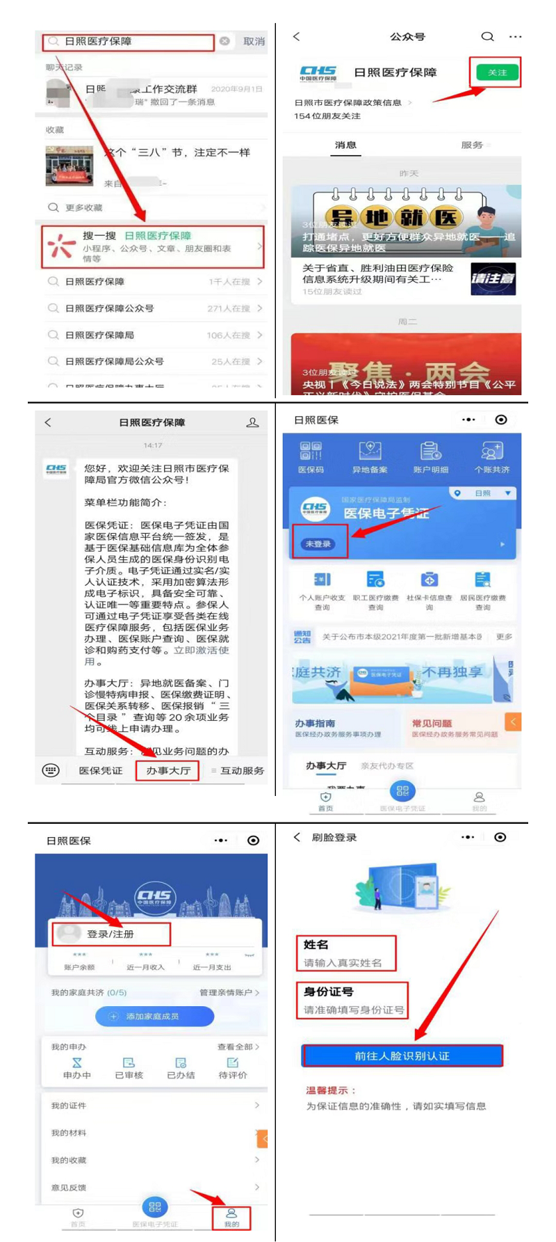 打开微信→搜索“日照医疗保障”→点击“日照医疗保障”并关注公众号→进入公众号后点击“办事大厅”→跳转至“日照医保”小程序(首次登录需要输入姓名、身份证号和进行人脸识别认证);