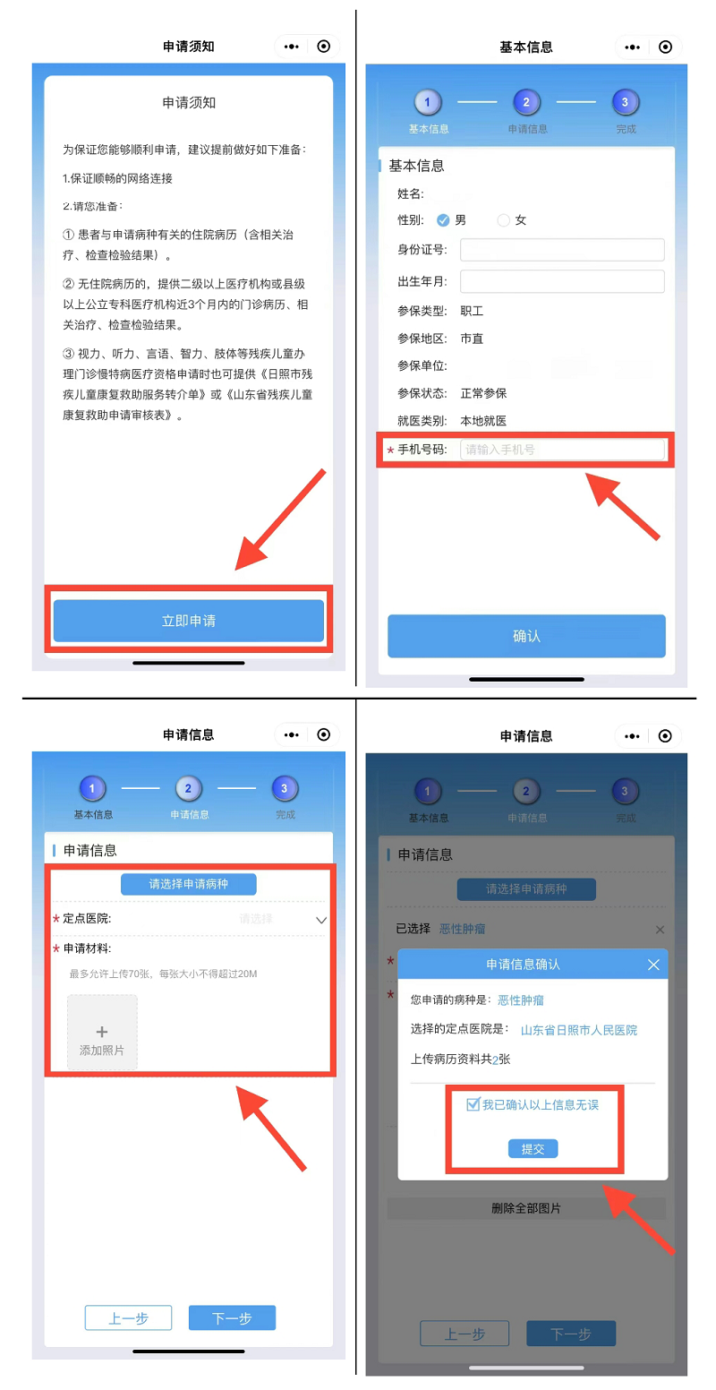 进入申请操作界面后→弹出办理申请须知界面→认真阅读提示并点击立即申请→进入门诊慢特病医疗资格申请-填写信息操作界面→标“*”的为必填信息→核对信息无误后点击“下一步”并点击提交。