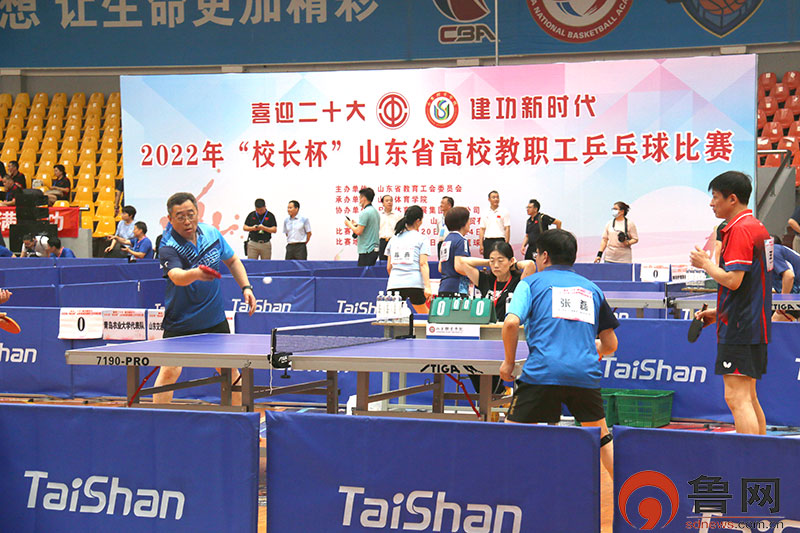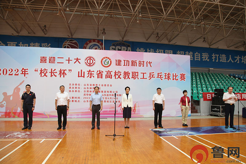 鲁网6月21日讯(记者 薛喜博) 6月21日,由山东省教育工会委员会主办、山东体育学院承办的“喜迎二十大 建功新时代”2022 年“校长杯”山东省高校教职工乒乓球比赛在山东体育学院日照校区国家篮球学院训练馆隆重开幕。来自全省63所高校的64支代表队,包括93名校领导在内的552名运动员、教练员、领队等参加本次乒乓盛会。